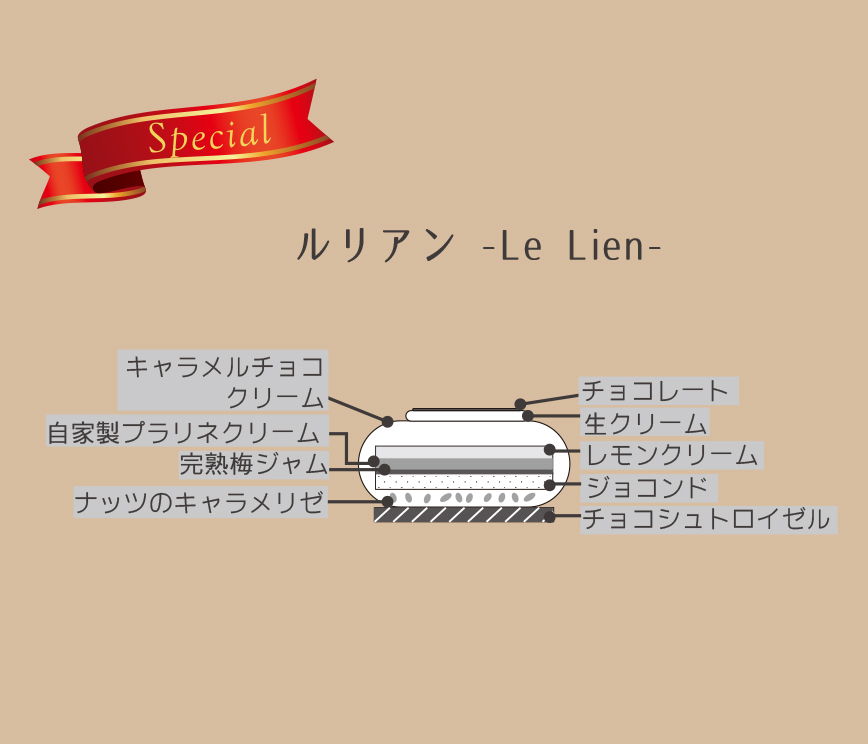 ほろ苦いキャラメルチョコレートクリームと自家製プラリネクリーム、レモンクリーム、